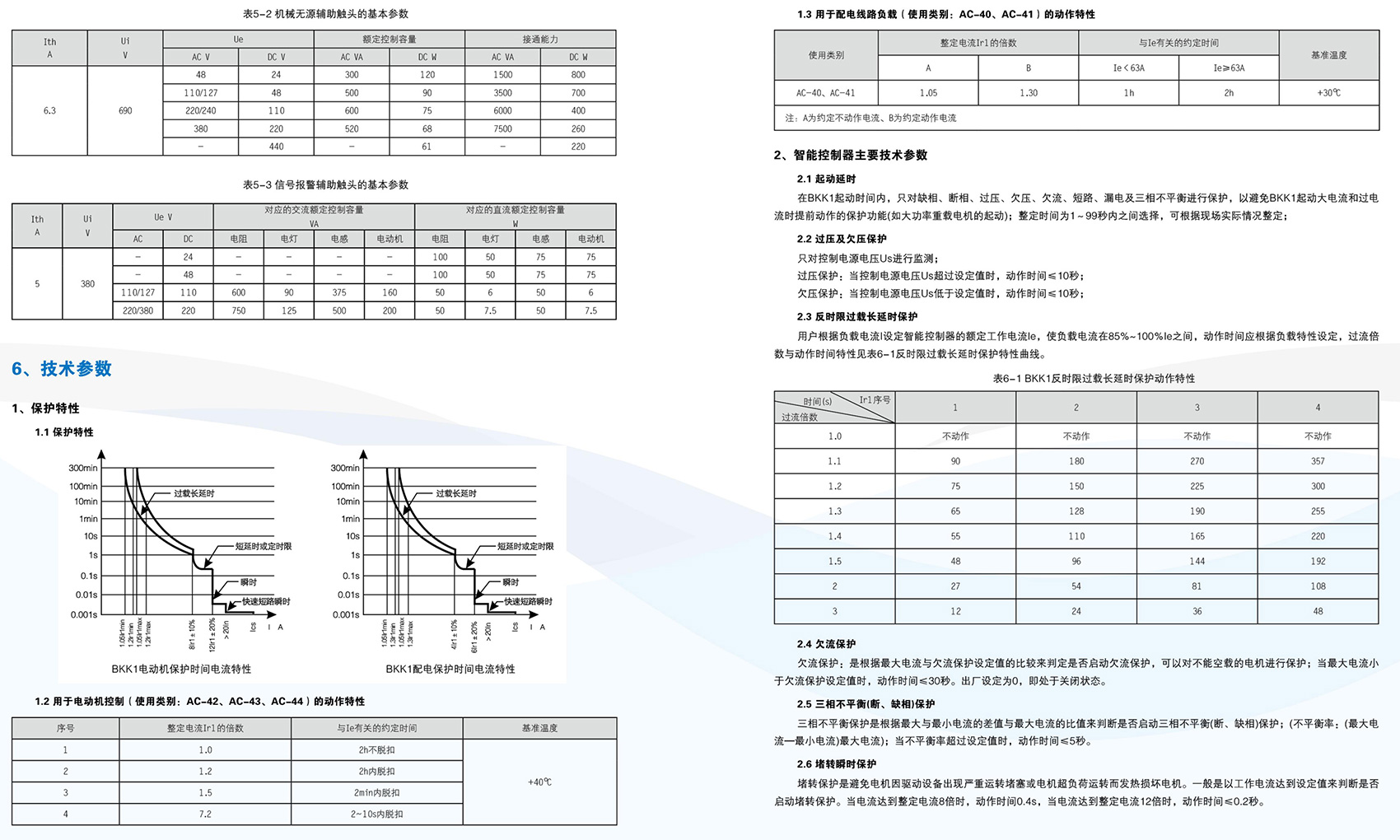 BKK1系列控制与保护开关电器主要用于交流50Hz(60Hz)、额定电压至690V、额定工作电流自0.4A至125A的电力系统中接通、承载和分断正常条件(包括规定的过载条件)下的电流,且能够接通、承载并分断规定的非正常条件(如短路)下的电流。BKK1系列采用模块化的单一产品结构形式,集成了传统的断路器(熔断器)、接触器、过载(或过流、断相)保护继电器、起动器、隔离器、电机综合保护器等多种传统的分离元器件。产品具有远距离自动控制与就地人力控制兼有的方式进行控制操作的功能,具有协调配合的时间-电流保护特性,具有控制与保护自配合、短路后连续运行,具有分断能力高,飞弧距离小、寿命长,具有保护整定电流均可调的特性,操作方便、配套模块多样齐全等优点,可以实现对电动机负载、配电负载的控制和保护。产品符合GB/T 14048.9《控制与保护开关电器》标准。